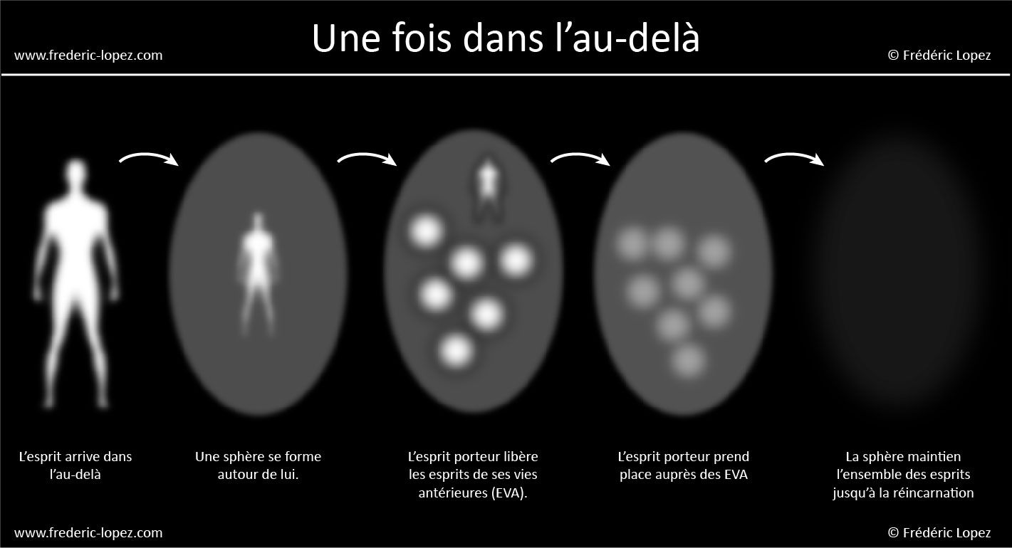 Rappelons-nous que l’esprit qui vient de passer porte toujours en lui l’ensemble des Esprits de ses Vies Antérieures (EVA) comme lorsqu’il était vivant, puis dans le non-visible.